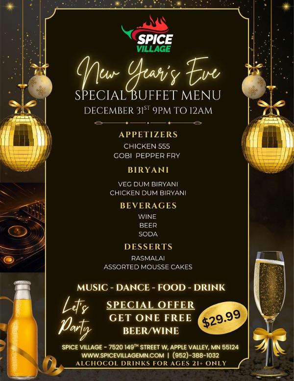 ?Ready to say goodbye to 2025 and hello to a delicious 2026? Join us at Spice Village for our *Music, Dance, Food, and Drinks*--everything you need for the ultimate countdown.
